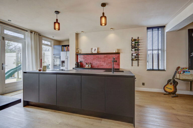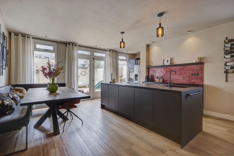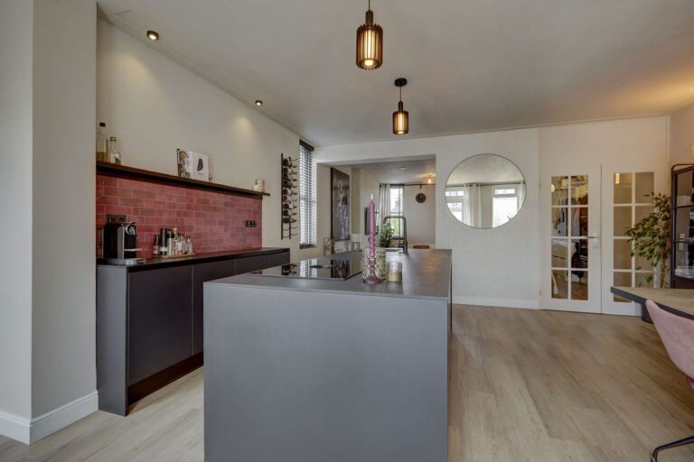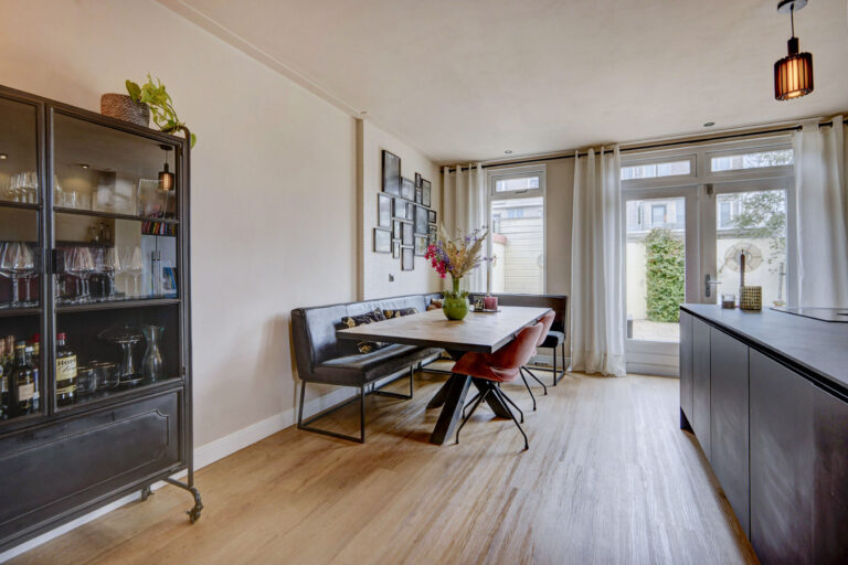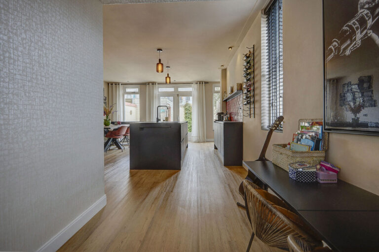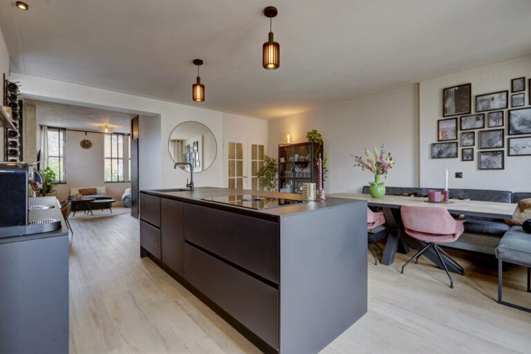 Je betreedt de woning via de hal met toilet en trap naar de eerste verdieping. De ruime, uitgebouwde woonkamer is heerlijk comfortabel door de vloerverwarming. Aan de voorzijde is er een knusse zithoek gecreëerd met ramen aan de voor- en zijkant en aan de achterzijde is de riante open keuken met kookeiland te vinden. Deze is van alle gemakken voorzien zoals een Bora kookplaat, vaatwasser, American Fridge (ter overname), en combi-oven. Ook heb je vanuit hier middels openslaande deuren toegang tot de heerlijk zonnige tuin. Achter in de tuin staan een ruime schuur en een achterom tot je beschikking