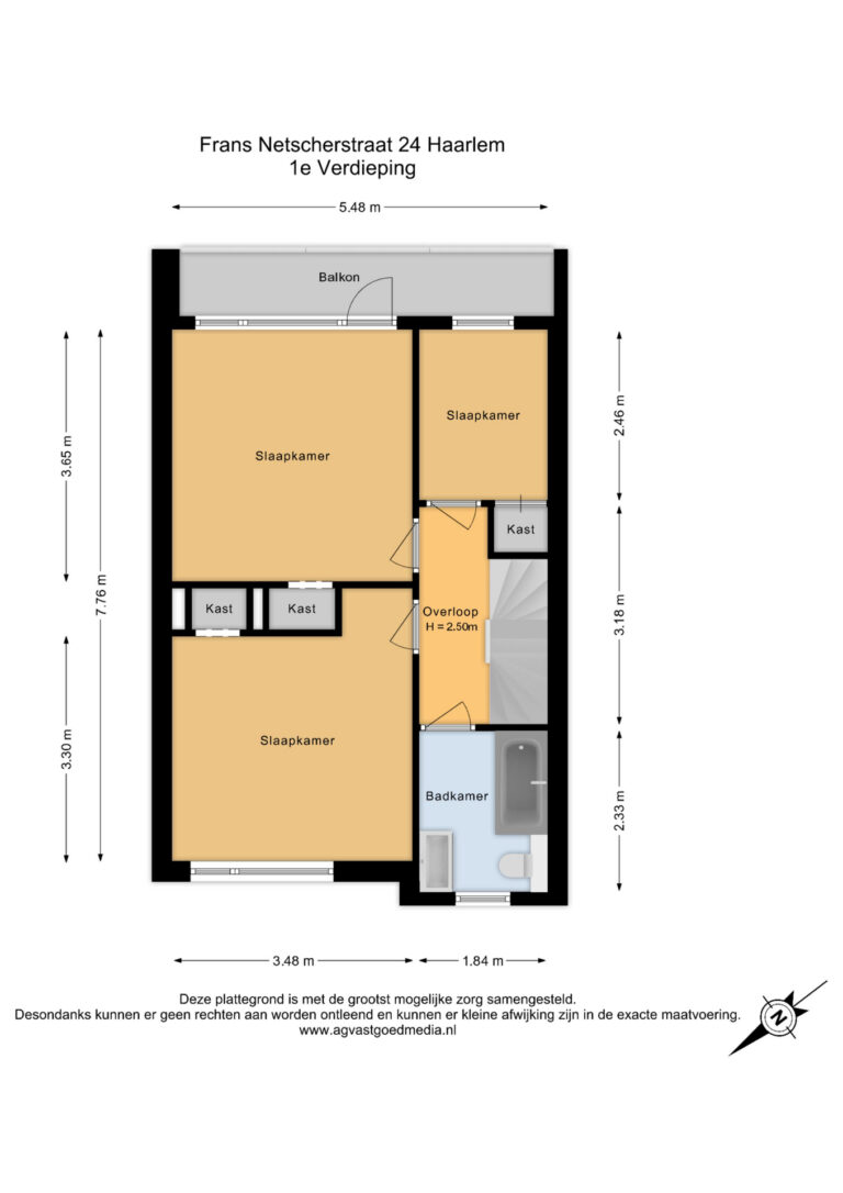 De eerste etage heeft drie slaapkamers. De ruime slaapkamer aan de achterzijde heeft toegang tot een balkon en is voorzien van een inbouwkast. De ruime slaapkamer aan de voorzijde heeft eveneens een inbouwkast. Daarnaast is er een kleinere kamer welke momenteel gebruikt wordt als garderobe, maar tevens kan dienen als werk- of kinderkamer. De moderne badkamer heeft een bad/douche, wastafel en toilet.