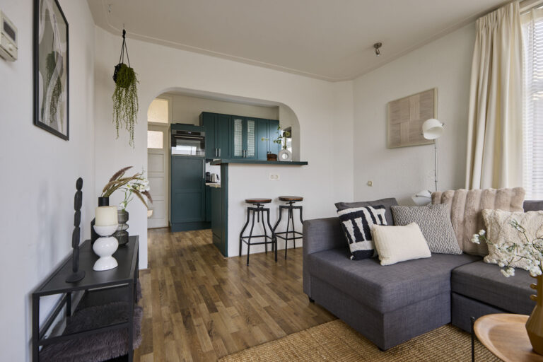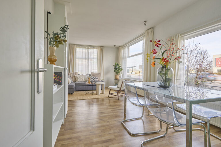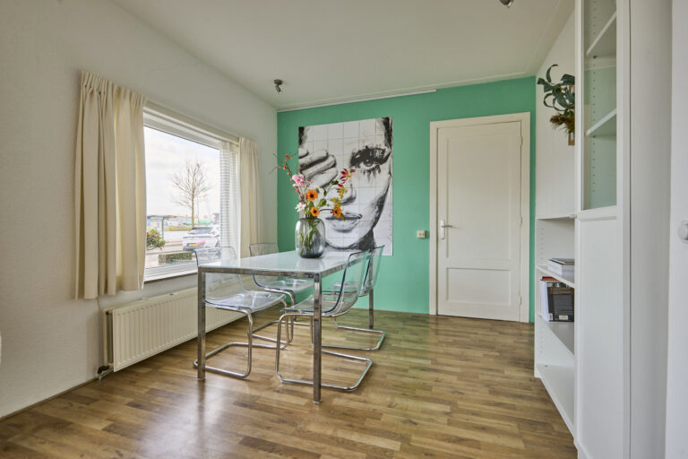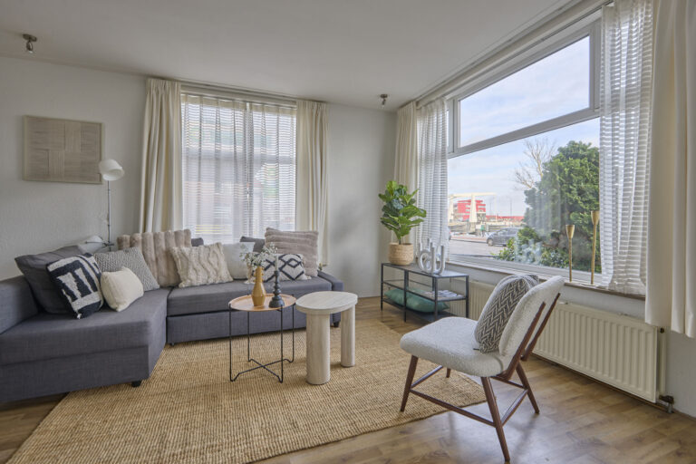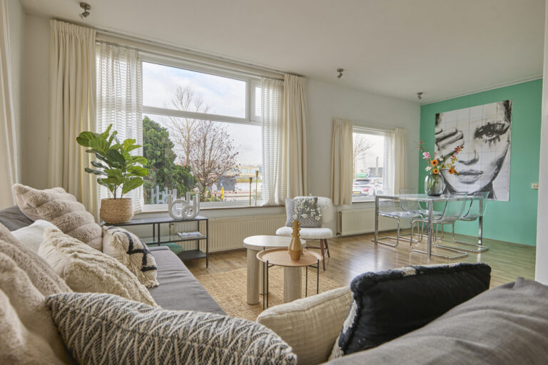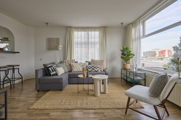 Via de voortuin bereik je de ruime entree van de woning. Vanuit hier betreed je de royale, lichte woonkamer voorzien van grote raampartijen met uitzicht dat nooit verveelt. De nette halfopen keuken is uitgerust met inbouwapparatuur en staat in prettige verbinding met de woonkamer. Zo vind je hier een combi-oven, 4-pits fornuis, koelkast en de vaatwasser. Verder beschikt de woning over een verzorgde badkamer met douche en wastafel, een apart toilet en een ruime slaapkamer.
